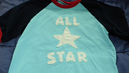 One plain T-shirt with unbleached, unfinished muslin flair. I’m really digging it myself actually. I’m quite pleased with how it turned out, despite how wonky the ‘S’ looks in that photo. It’s not really that wonky, I promise.