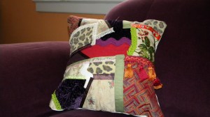 Pat’s grandmother was a quilter and while I admire the craft of it, I just haven’t felt drawn to it enough to do it. This was my first feeble attempt at it. While I like the results, I’m not sure I’m going to jump into more quilting anytime soon. Grandma had made this amazing crazy patchwork quilt that I fell in love with, that she used old ties in the making of. It’s really a work of art and way beyond my feeble beginner skills. Somewhere along the line, I acquired a book about crazy patchwork and it broke down the crazy quilt process into small bites, pillows, laundry bags, instead of a queen size bed quilt, so it seemed dare I say, approachable? Although I still don’t think I could ever come up with something as beautiful as Grandma’s crazy patchwork quilt.