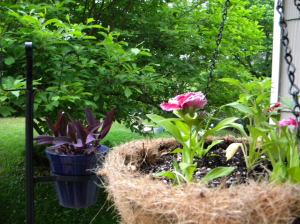 It was in the 90’s and sunny here all weekend. I finally found the time to go down to the nursery just south of town I like so much and got some annuals for the hanging baskets. I kept it pretty minimalist this year, with just pinks on the front porch and I can’t even remember what in the baskets on the back porch. And of course a few begonias for here and there. None of my begonias wintered well. Couldn’t possibly have anything to do with the fact that I pull them all into the basement at the first frost and leave them there all winter, without alot of attention (or water)….never mind they have made it through before, which is one of the reasons why I fell in love with begonias to begin with. They seem to do well with my tough love. This winter was a little too much for them. Come to think of it, it was a little too much for alot of us.