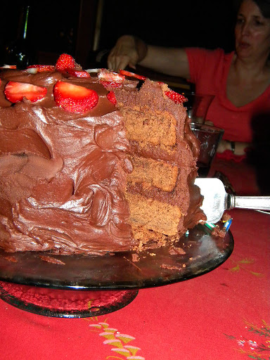 Things I learned? Transporting a triple layer cake is no easy feat. Next time, I’ll assemble it there. I thought the cake itself was a wee bit on the dry side – it may have been slightly overbaked, but it was still good. And the frosting. Oh my. It took 2 and a half hours to make, stirring it every 15-20 minutes. Worth it. The recipe makes enough for you to assemble a three layer cake and fix just about every shortcoming with a mound of frosting. Now, that’s a good recipe.