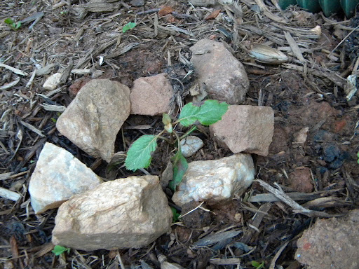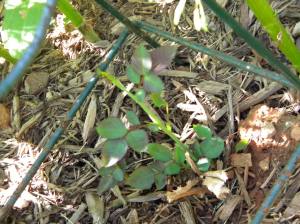Once upon a time, in a land far away, Pat planted an oakleaf hydrangea. Everytime we pass by the old house when we are visiting friends there, he sighs. He talks about how he’d like to get another one. So, in swapping some plants with a friend, I noticed he had an oakleaf hydrangea. And it had a tiny offspring next to it. So, I grabbed it. It had the tinest root, but it was a root. I brought it home and stuck it in the ground. It didn’t do much, but it didn’t die either. Pat looked at it rather skeptically, telling me they are hard to get established when they are that small. I have been watering it every day and when Pat emptied the compost bin the other night, I took some and dumped it on the hydrangea. It has noticeably perked up since. It’s still small, I am not declaring victory yet, but, I haven’t killed it yet either. When it sprouts new growth, I’ll let you know. And then there is the rose bush. It was a gift when we bought the house. We have alot of shade and what sun we do get, I prefer to use for things like tomatoes. (Priorities you know.) I’ve moved it over the years, hoping this spot will be sunnier than the last,but then trees grew and turned out that spot wasn’t sunnier. I noticed that since losing some limbs this winter, a spot in the front bed that might work. I ripped out the entire bed (it was covered in looseneck goosestrife) and in the process, moved the rose bush again. I cut it back hard and replanted it. It did nothing. I watered it every day, nothing. A month passed, nothing. I gave up and started ignoring it. Then, when I was out checking on the nearby hydrangea, I noticed the tinest new leaf on the stubs sticking out of the ground. Each day, it’s gotten a little bit bigger. This one I will declare victory over. I didn’t kill my rosebush after all.