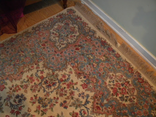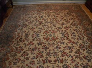 I just so happened to be at the shop when a guy came in unloading a van full of housegoods. He dumped the rug on the ground and it had a $50 price tag on it. Really? It literally landed at my feet. The other end of the rug had the label – I started getting excited seeing the name of the manufacturer and the fact that it was 100% wool. We unrolled it so I could check it all out and omigod I knew I could not pass this up.