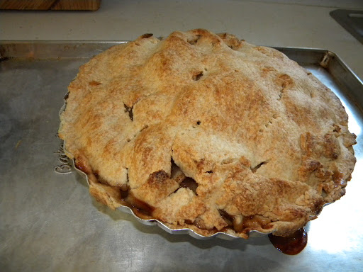 And then, dump your apples on top. I put extra apples in my pie because that’s the way I like it. Cover with the top crust, poke a few holes in the thing and bake. Since my crusts never quite perfectly fit over the top of it, I don’t bother too hard with sealing edges, which means putting a cookie sheet under the pie in the oven. Otherwise, you will smell burning apple pie for weeks on end when you turn the oven on.
