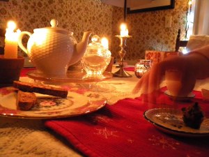 The activity in her advent calendar the other day was to have a tea party. We spent the day baking cookies and when I wasn’t looking, she set some things out she wanted to use. Like the tea cups Uncle Dave gave her last year. And my new pink depression glass cake stand. And ‘the fancy sugar bowl’.