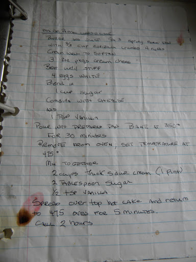 The recipe is my treasured, handwritten copy of Mrs. Van Popple’s cheesecake.  I think I was about 8 when I declared this the best cheesecake ever and my Aunt Loretta made it for me every chance she got.  I’m not really sure who Mrs. Van Popple was, I think she may have been married to someone my Uncle Peter worked with, for?  Whomever she was, she had one incredible cheesecake recipe. Andoreda, as we kids called her, fought a long, hard battle with cancer.  The last time I saw her, she said, oh, let me get you that recipe, and I knew she knew, this was the last time I was ever going to see her.  There was no way she would just hand that recipe off.  Anytime I asked about it before, she would just bake me the cheesecake.   She had a brain tumor at that point, for years I had gotten letters from her with gibberish in the middle that I knew was caused by it, and sure enough, there is some gibberish in the recipe.  I had to learn to bake before I could decipher it.