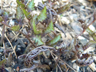 Last summer, my Japanese painted fern really struggled in the dry weather. I carted water down to it from the rain barrel quite a bit, but I never seemed to water it enough. I worried all winter I had killed it. It originally came from my Aunt Loretta’s garden and I didn’t know how to tell my Uncle Peter I’d killed it. Thankfully, I’m spared from that.