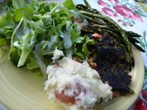 Despite our tradition of having guests to Christmas dinner, we’ve never really settled on a traditional menu, one that we serve year after year. It’s always an experiment. Easter however, is a different story. Our one tradition (besides the Easter Bunny leaving a trail of eggs all over the house) is our meal. We’ve had it for a good many years now and it’s always spot on. Pesto-encrusted salmon, parsleyed red potatoes, salad and roasted asparagus.
