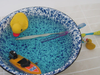 That would be her father’s toothbrush, face down in the blue dyed water.  And that would be her toothbrush, face down on the floor of my tub.  A tub that is admittedly, not exactly clean.