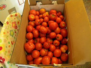 That’s what 27 pounds of tomatoes look like, in a box. They were ‘scratch & dent’ tomatoes at the farmer’s market, which is the way to go if you are buying tomatoes to put up. Last winter we went through not quite 4 cases of tomatoes. I yielded 18 pint jars yesterday – a case and a half, so I will need to spend at least one more afternoon in the kitchen, maybe two before the end of the growing season, just for tomatoes. I still need to put up some peaches and I’m getting requests for more of my green bean pickles.