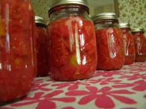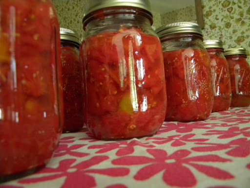 Tomatoes are where the whole foodie thing started for me. I realized back in college, some 20 years ago, that they were really only worth eating when they were in season where I lived and not trucked in. Since then, not only have I almost always had a little spot of tomatoes growing somewhere, I’ve learned how to put them up, so I can eat my tomatoes all year long. I started canning well over a decade ago, having scooped up a canning pot at a rummage sale for a song, then took a food preservation class up at Monticello one Saturday morning. I’ve taught countless friends how to can over the years too. I’m really uptight about knowing where our food comes from and how it’s packaged, so canning is essential to me.