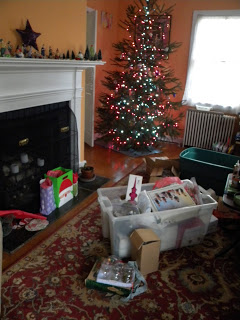 Currently my living room looks like Christmas has exploded in it. Boxes everywhere. The tree is halfway decorated, with oodles more ornaments waiting to be put on. There are some wrapped presents, some handmade presents to be finished floating around, decorations that need to go somewhere, plus our usual clutter.