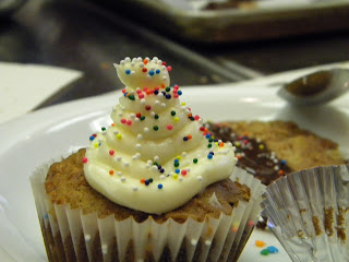 You’d think that after all that cooking, I’d be steering clear of it for a few days.  Well, sort of.  This morning I assisted with a kid’s baking class at  The Charlottesville Cooking School, dragging Edie along so she wouldn’t spend 2 days in a row, in her pj’s watching tv (like she did last weekend, also a three day weekend).  They made coconut macaroons, chocolate dipped oatmeal cookies and carrot muffins, with cream cheese frosting.  Can you tell which muffin was decorated by a third grader and which one was decorated by me?