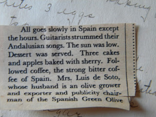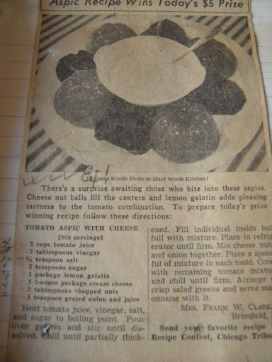 And then there was this. Tomato Aspic. With multiple exclamation points on either side of EX, which I gathered was her way of saying a recipe was good, as it is on many recipes throughout her cookbooks, especially ones with stained pages and other notes. Stained pages are a dead giveaway a recipe has been tried and probably well liked. I have never, ever been inclined to try any recipe for tomato aspic, but in going through her cookbooks today, I find myself wanting to try this. Perhaps I shall.