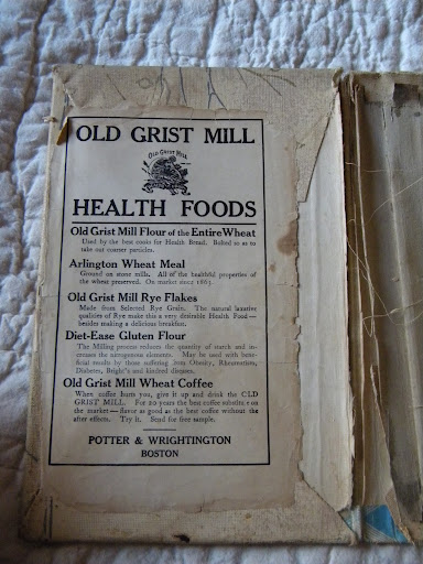 This was glued to the inside front cover. I think she covered the book in a wallpaper scrap and that appears to be a label from a product she wanted to remember. This is something I do – shove labels I want to remember into cookbooks. Hers was glued in, on top of the book cover edges.