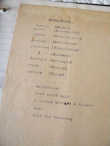 This recipe, for green sauce, is written partly in German, with English translation.
