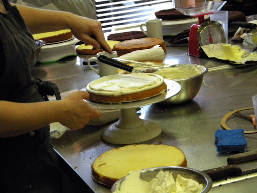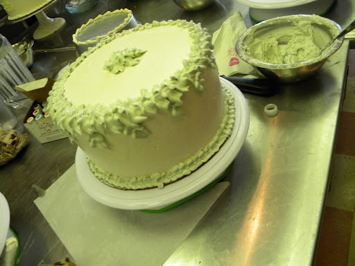 It was a two day class, with Day One being for the making of the cakes, frosting and some of the fillings with Day Two was set aside to put them all together.  While I learned a few new things Day One, what I learned primarily is that I know far more about baking than I realized or give myself credit for.  I have learned by just doing: by reading recipes and following them to the letter.  Even if they don’t always look good, they usually taste good. Because recipes don’t tell you the finer points of how to make icing pretty when you put it on. This is why I signed on for the class, to kick it up a notch, and make my cakes look as good as they taste.
