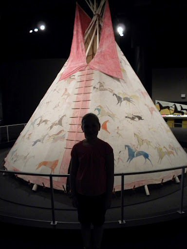 Edie wanted her picture taken by the tipi in the Song for the Horse Nation exhibition. I liked the way this one turned out. I have talked here before how my camera is great with natural light, crummy with any other sort of light. One of these days I will get a fabulous camera that’s not a point and shoot that can take pictures in all sorts of light. Until then, I just live with it and appreciate the unique perspectives. I think the shadow in front of the tipi is more fitting anyway.