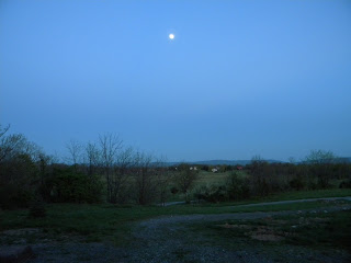 Twilight, with the not-quite-full-moon rising over the Blue Ridge, just to the east.