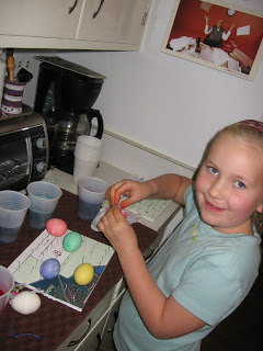 People say I’m crafty and creative, but the true creative soul in our house is the wee one. Ever since that spring break where I let her have a little too much unsupervised TV time and she watched Martha Stewart decorate Easter Eggs, she hasn’t been content to just ‘color’ eggs. Oh no. There was the year she made the drying rack, just like Martha’s of course, out of foamcore and straight pins. She made it entirely herself, all I had to do was contribute the materials.