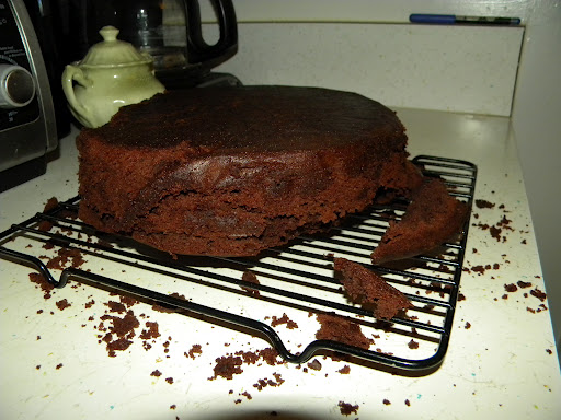 The recipe I was following was Chocolate Blackout Cake from Wayne Harley Brachman’s Retro Desserts cookbook.  I love this cookbook.  The lemon square recipe in this is my go-to.  The cream filled chocolate cupcake recipe?  One of my standards.  So I trust this cookbook.  I think I just forgot that pastry chefs tend to have better equipment than us home chefs and their cake pans are taller. It made a difference here.