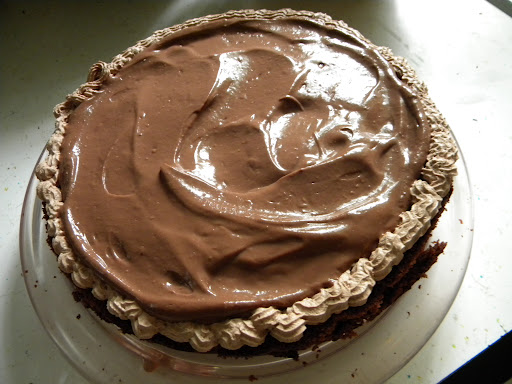 I learned in my cake class a good way to keep the filling contained between your cake layers is to pipe a row of frosting around the edge.  This cake was being frosted in a ganache frosting.  I wasn’t sure how this would work as my edging, so after some brainstorming, I made a chocolate whipped cream and used that to keep the pudding filling in place.  It also gave me a good chance to practice using my pastry bag.  I still need practice.