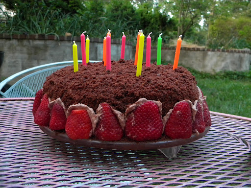 The birthday boy’s request was for ‘chocolate, chocolate, chocolate and maybe some fruit’.  With that in mind, I cut some strawberries in half and used the very last of the chocolate whipped cream to ‘glue’ them to the sides of the cake.  A little time in the refrigerator to firm everything up and voila, chocolate chocolate chocolate cake with some fruit.