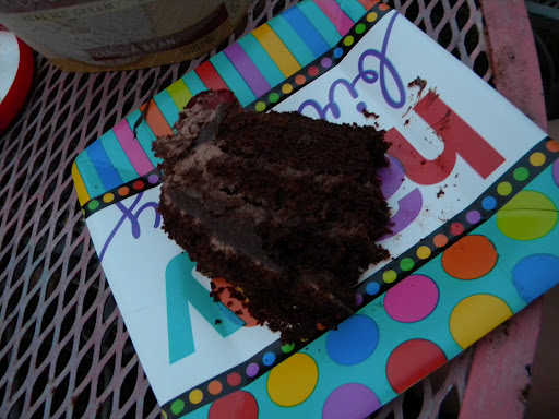 The finished product was tasty.  I doubled the ganache frosting and used a full batch of the pudding.  Next time I might try a double batch of pudding, as I like a nice thick filling between my cake layers.  (The recipe in the cookbook calls for 1/2 batch.  Definitely not enough.) Despite the structural issues, the cake itself was just right – not too dry, not too moist.  It could have used more pudding as filling  but everyone seemed to like it just fine the way it was.  Thankfully, thirteen year old boys are much easier to please than forty-something amateur pastry chefs.  Although I do get a kick out of hearing them talk about how I’m going to make the next birthday boy an even better cake than this one.  That’s my kind of trash talk.
