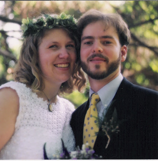 It was held in my mother’s back yard. We had a small budget to work with, which encouraged creativity. The groomsmen insisted I was not going to make the groom (or them) wear any sort of ridiculous rented garment and I didn’t. I did make him wear a tie though. And he wore new pants, fancy ones even, he’d picked up at Salvation Army with the tags still attached.