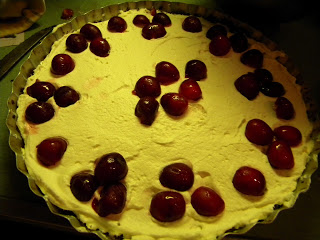 After the pie cooled for a few hours, I spread a layer of fresh whipped cream on top of the pudding, then garnished the pie with fresh cherries.