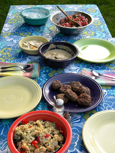 I also followed Tim’s side suggestions, with the addition of the watermelon salad. For the couscous, I simply tossed some fresh thyme and chives from the garden with some chopped cherry tomatoes and black olives, salt & pepper and a dash of olive oil. I’m the only person in this house who likes cucumbers, so I left them out, although they would be a good addition as well. There were some in the tzatziki, so I didn’t want to push it. As for the “Watafet Salad”, I chopped up about a quarter of a watermelon and a handful of fresh mint. I added crumbled feta, salt, pepper, lime zest, the juice of a lime and a generous dash of olive oil, tossed it all together and served it. It didn’t appear to be a salad that would keep well, so I wouldn’t make more than you can eat at the time. However, it was quick, easy and would be a great dish to carry along to a potluck.