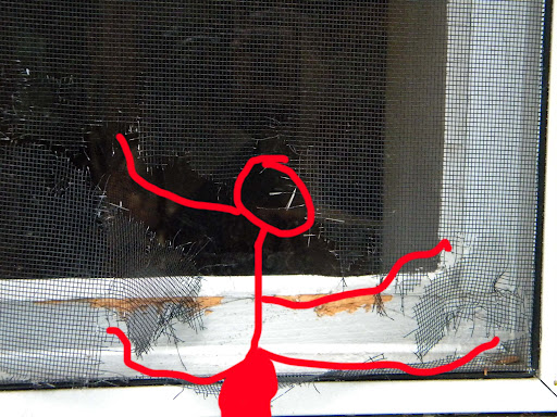 Since this is the internet and I can’t pose for you in person the way the squirrels position themselves when chewing through the screens, I got fancy with technology and drew you a stick squirrel. It’s other foot was below the window line.