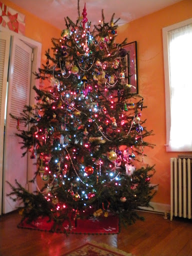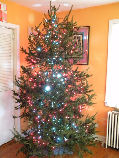 And here is the finished tree.  While pictures never do justice to it, you can see what a difference lots of lights and a giant tub (and a half) of ornaments and a few strands of beads do for a perfectly imperfect tree.  The only thing missing are candy canes, which will be purchased and hung in the next few days.
