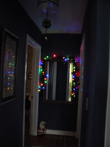 When I talk about how my house is small and dark, I’m not kidding.  With the days so short this time of year, I look to light up our house anyway I can. Lights and garland are a theme all over the first floor. Santa sits in a corner, under a mirror that gets a garland and multi-colored lights while mistletoe hangs from a nearby overhead light fixture.
