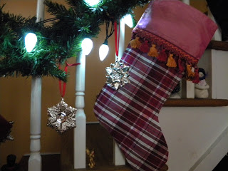 Christmas throws up all over my living room. Garland, lights, my sterling snowflakes, stockings, advent calendar, card holder and little holiday tchotchkes we’ve acquired over the years get piled on top of each other on the stair wall.  Pat & I have monongramed purple and red velvet stockings from Pottery Barn that we got before Edie came along.  I couldn’t find one similar for her, so I made her one instead.