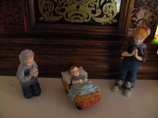 The mantel gets covered in a beaded wire garland, vintage Christmas lights that came out of my Granny’s basement (apparently unused), various trees and a Nativity set that looks like the kids from The Best Christmas Pageant Ever