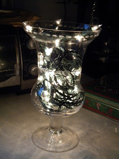 A strand of lights in an old glass vase.  It makes a wonderful kitchen counter lamp in these cold, dark months.  Never underestimate the brilliance of a single strand of lights.