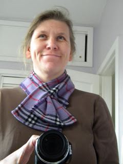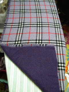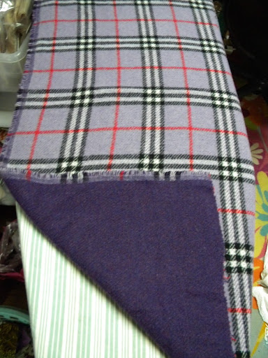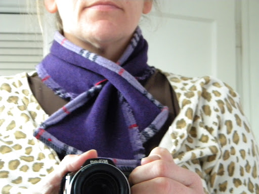 This purple plaid has been kicking around in the stash for some time. I think I got it at either an old SPCA rummage sale or Focus Flea Market (both of which are no longer to my great sadness. More than half my house and wardrobe came from those two places over the years). I’ve never seen anything like it. I think it’s a wool fabric. It’s woven and two layers – the plaid on one side and a solid purple on the other. It’s a funky size too – a 35″ x 37″ square. For years I’ve wanted to do something with it that would show off both sides, but couldn’t come up with a satisfactory answer. Until Friday. I was playing around it, bemoaning to Edie that it just wasn’t big enough for anything fun, that I didn’t particularly want to put a seam in it, but maybe that was just what I needed to do when it hit me.
