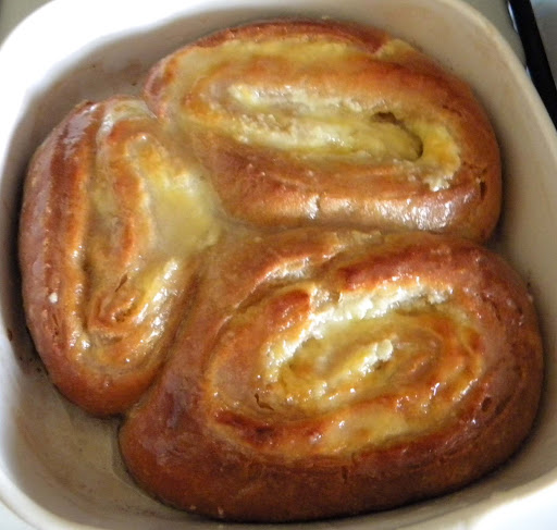 A few notes on the recipe – which I mostly followed.  I subbed some spelt flour for white flour and used buttermilk instead of the called for milk with vinegar mix. I also ignored the pan advice, reaching for a cake pan that was not big enough (despite my better half standing there telling me the pan wasn’t big enough) so that I could have that nice round pan of buns.  Not all of them fit in that pan, which meant I baked two pans this morning (there’s a third in the freezer, as I split the batch in half.  I don’t need all those buns lying around and I do love having something I can just pull out of the freezer.) and explains the first picture of the 3 buns in their own pan.  The top of the buns on the upper rack of my oven got a little brown, although they were only there for 25 minutes.  They tasted just fine though (and I’ll see if my dear husband won’t mind recalibrating my oven for me today).