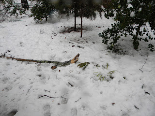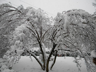 Needless to say, schools were closed and because of the weight of the snow, there were many downed tree branches and power lines.  Our beloved pink dogwood in the front yard lost a few limbs – mostly smaller ones at the top – we were lucky there. We lost a huge limb off a tulip popular in the back yard, the oak lost some limbs and there are still roads closed around town due to downed trees. We have a gas stove and hot water heater, so we had coffee, hot showers and hot food.  We didn’t have heat, but as the temperature hovered above freezing and we don’t keep our house terribly warm anyway, that wasn’t too awful. Wednesday night after dinner, the three of us climbed into our bed upstairs with books & flashlights and curled up for the night.