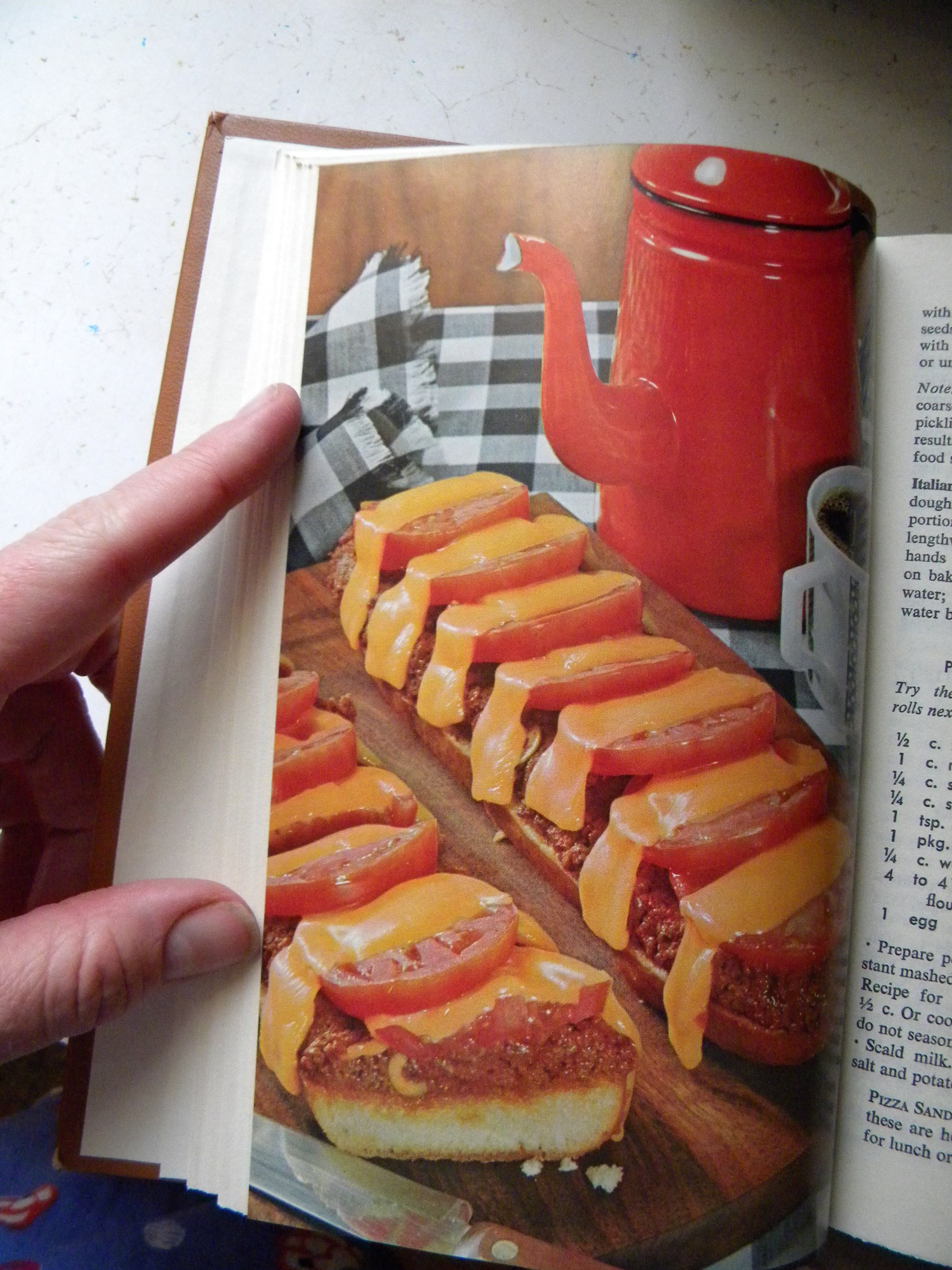 A recipe for “Arab Bread” calls for the bread to be served warm, torn open and wrapped around bit of lamb.  In the corner margin above the recipe, there is a handwritten note for marinated steak strips – I am guessing the marinated steak works just as well.  There are stained pages, starred recipes,  adjusted cooking times notes, and even a “NO” next to one recipe, all marks of a well used cookbook.