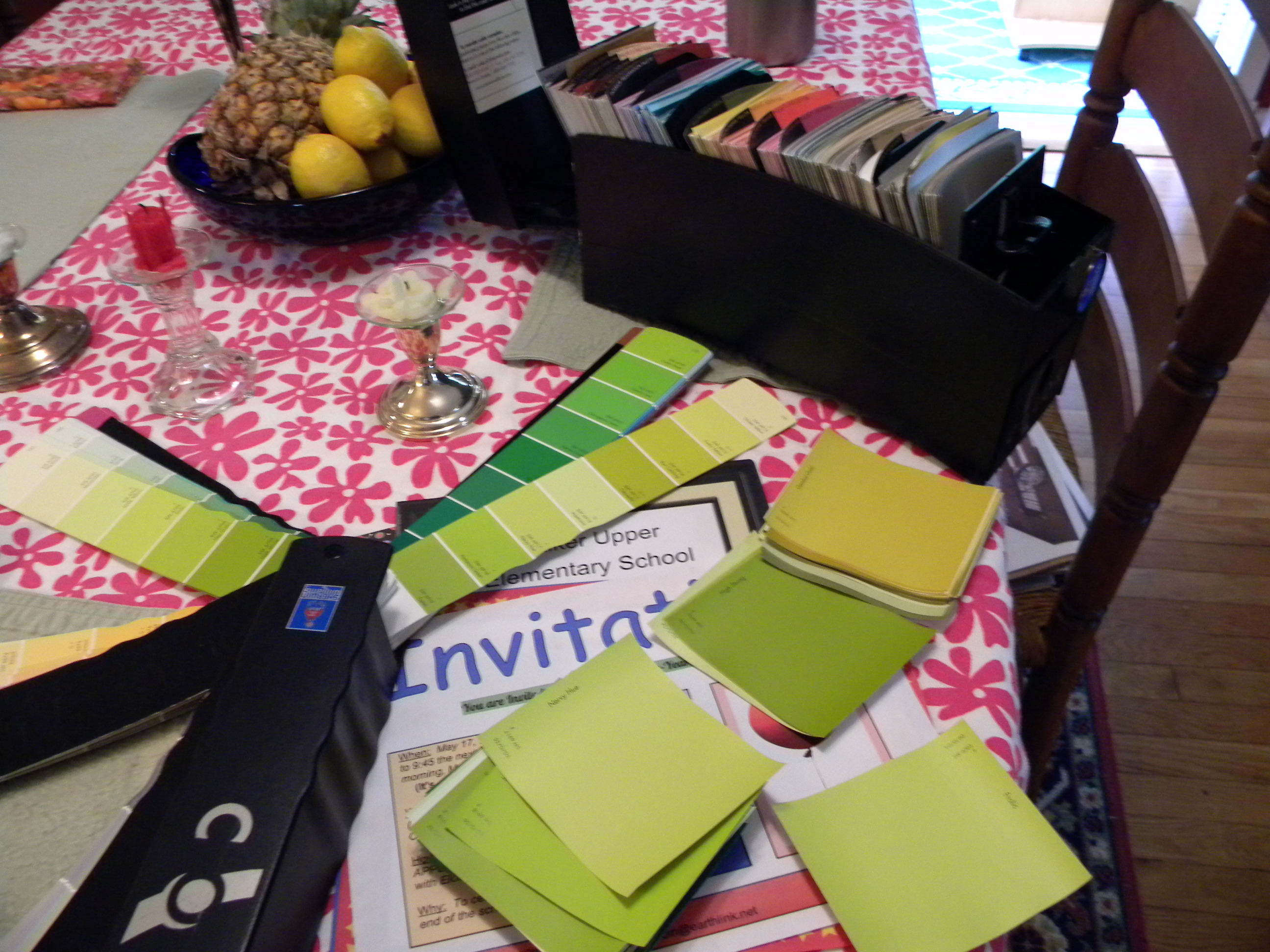 I officially broke out the paint box. (The last vestiges of my old Interior Design career. The Sherwin-Williams fan deck and sample box. ) Betty & I have been consulting quite a bit on colors for her building, so I ended up hitching a ride to Sherwin Williams with her yesterday to get samples.