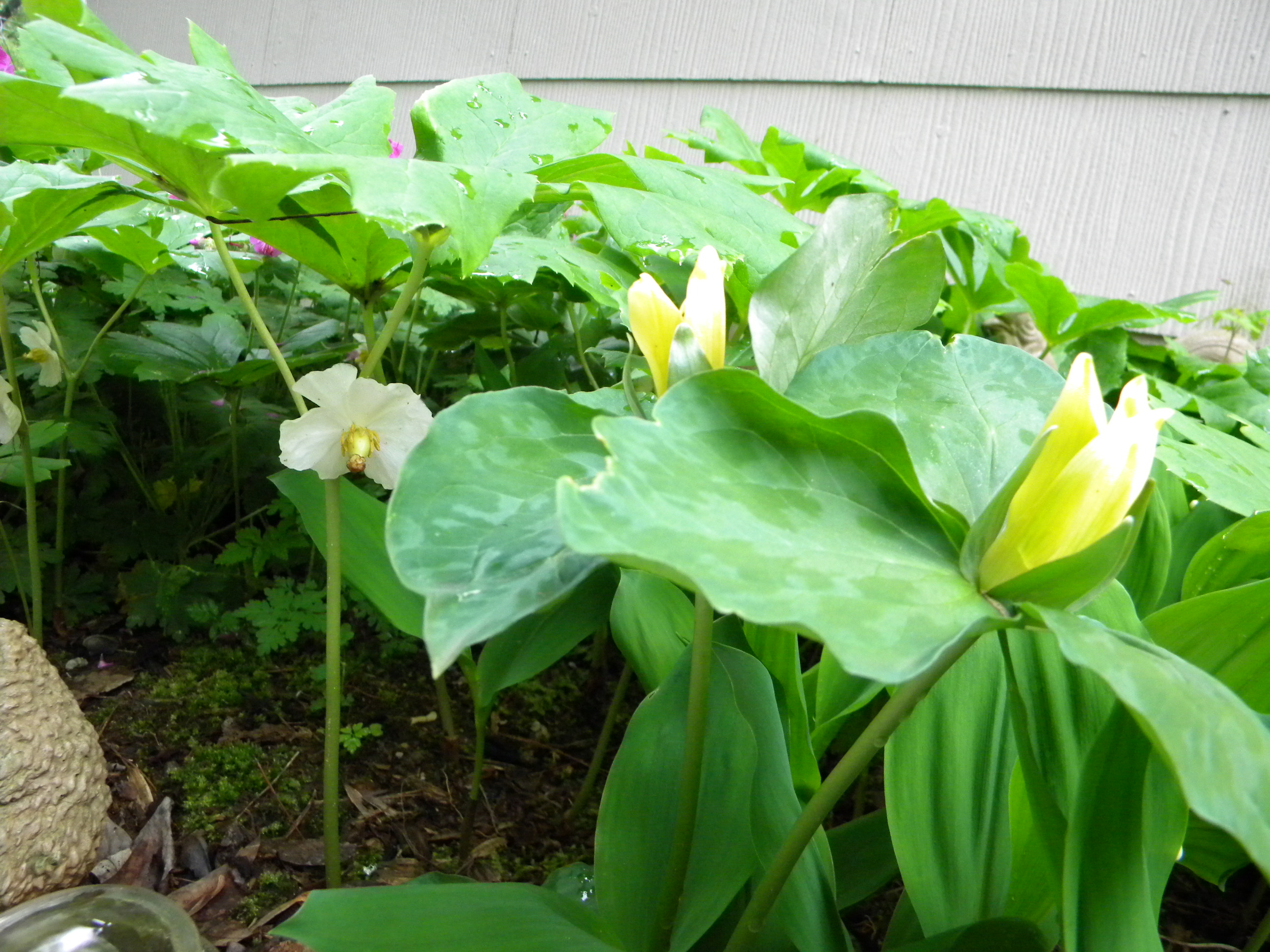 Two kinds of wild geranium, lilies of the valley, may apples & trillium.