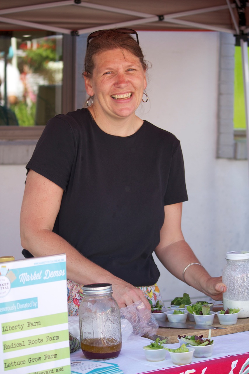 It being the salad dressing demonstration I did down at the City Market last weekend.   I recently joined the board of Market Central, the non-profit that works to support the market.  I am on the education committee, so I am working to help line up classes this season.   We are expanding classes this season from just food preservation classes such as canning and the like to include some basic cooking classes.   We also wanted to add more demonstrations, which have been well received in the past.   My friend Chef Mark Gresge of l’etoile is frequently down there, schedule permitting, doing this, helping to promote new ways of cooking what’s in season that day.  The idea was that we’d build on what he does so well.   I casually mentioned that I’d be willing to do something down there, that I had just done a salad dressing demonstration for a group and next thing I knew, our kick-ass administrator Matt had me scheduled to come down there and do a salad dressing demonstration at market one Saturday.