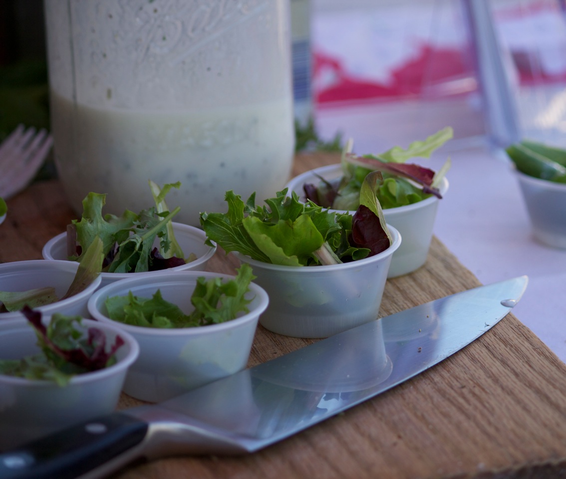 IMG_6187It just so happened Mark was down there that day too, so I joked we were going ‘head to head’.  I whipped up an olive oil-red wine vinaigrette and a buttermilk ranch dressing, and served it on top of greens donated by some of our vendors:  Lettuce Grow Farm, Radical Roots and Liberty FarmBrightwood Farm donated the herbs I used in my buttermilk ranch dressing.