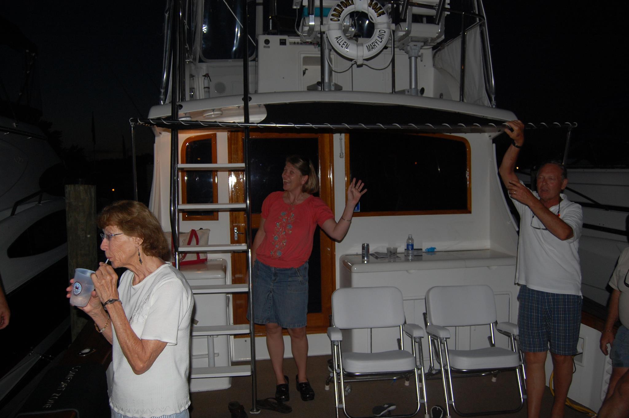 And so, after dinner, we wandered around the marina.  We came across a lively group sitting on their boat that we engaged in conversation.  Next thing you know, they invited us to come aboard for a drink.  Seeing this as how we were going to get Clara on a boat, I hopped aboard.  When everyone else realized I wasn’t coming ashore until I finished my Coors Light, they all came aboard too.