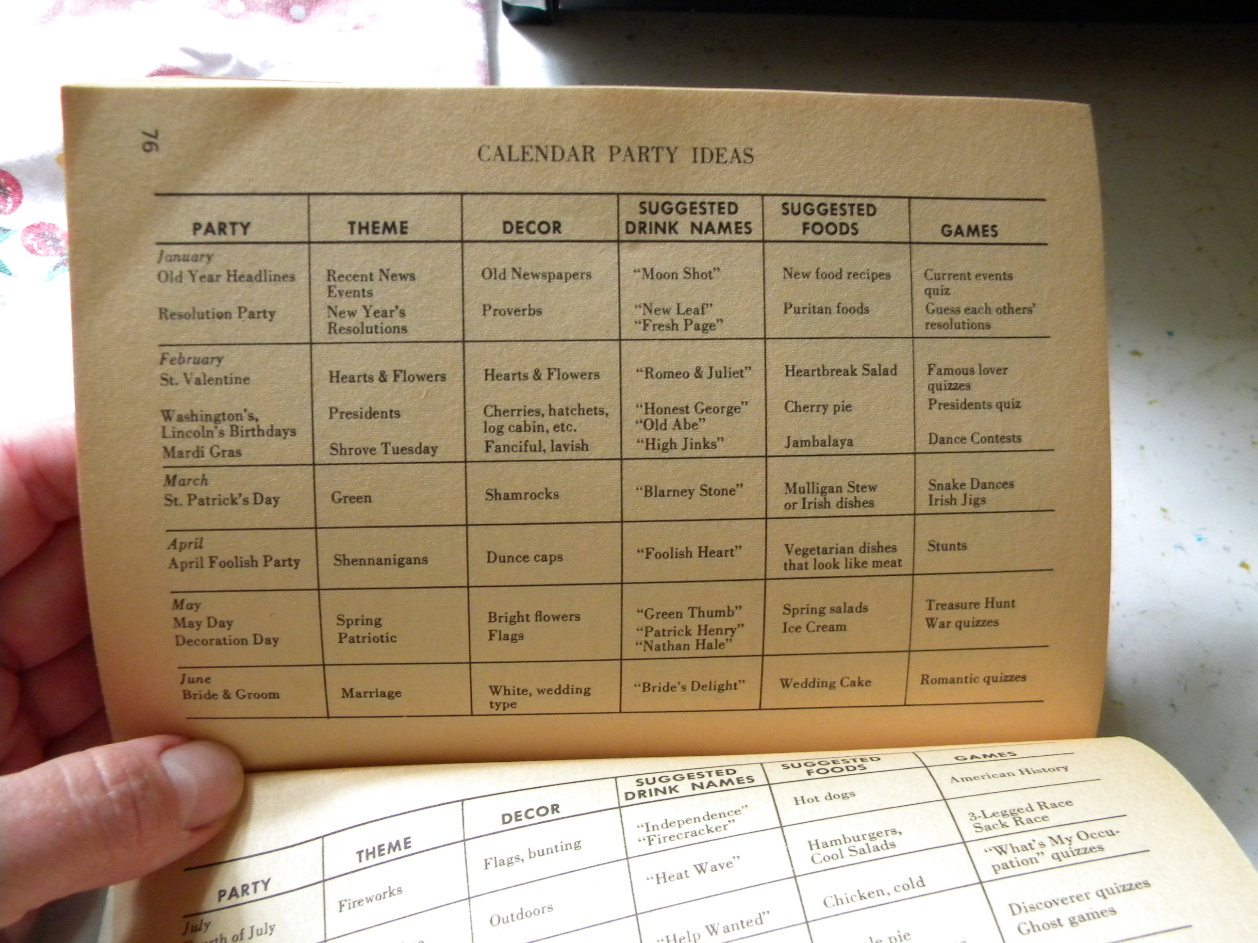 Chapter six is “Party Perfect Foods” featuring foods that are perfect to serve buffet style while showcasing your culinary skills – such favorites as beef stroganoff, chili con carne, chow mein with fried noodles, veal scalloppine and jambalaya.  With chapter seven we leave the food behind for party theme ideas.  “‘Something new and different…..out of the ordinary.’ This is what people like most about going to a party.  And with a little imagination you can make your party an event.”  There is a two page spread of Calendar Party Ideas with themes, decor, drink names, foods and games suggestions broken down by the month to ensure your event is a complete success.