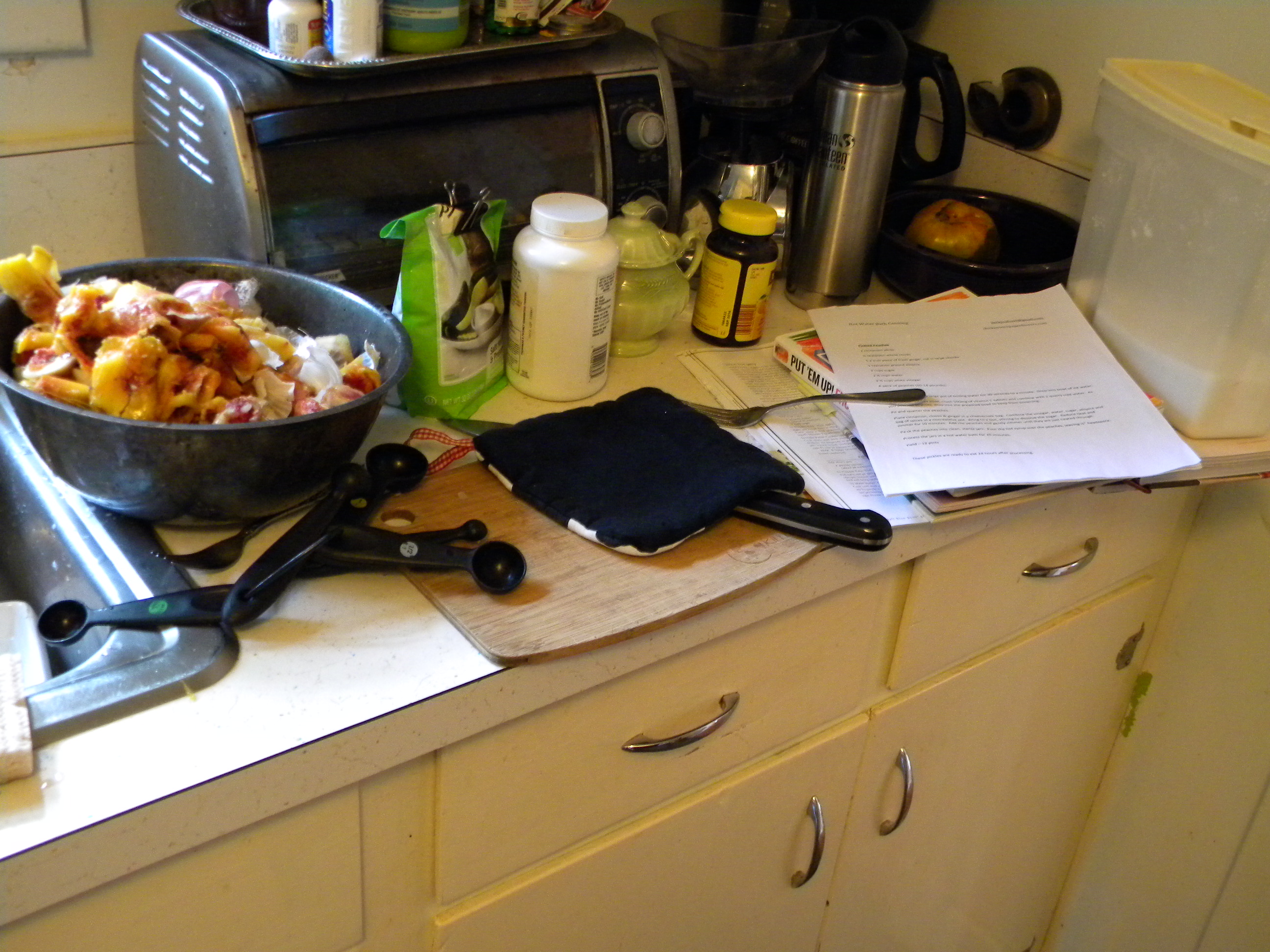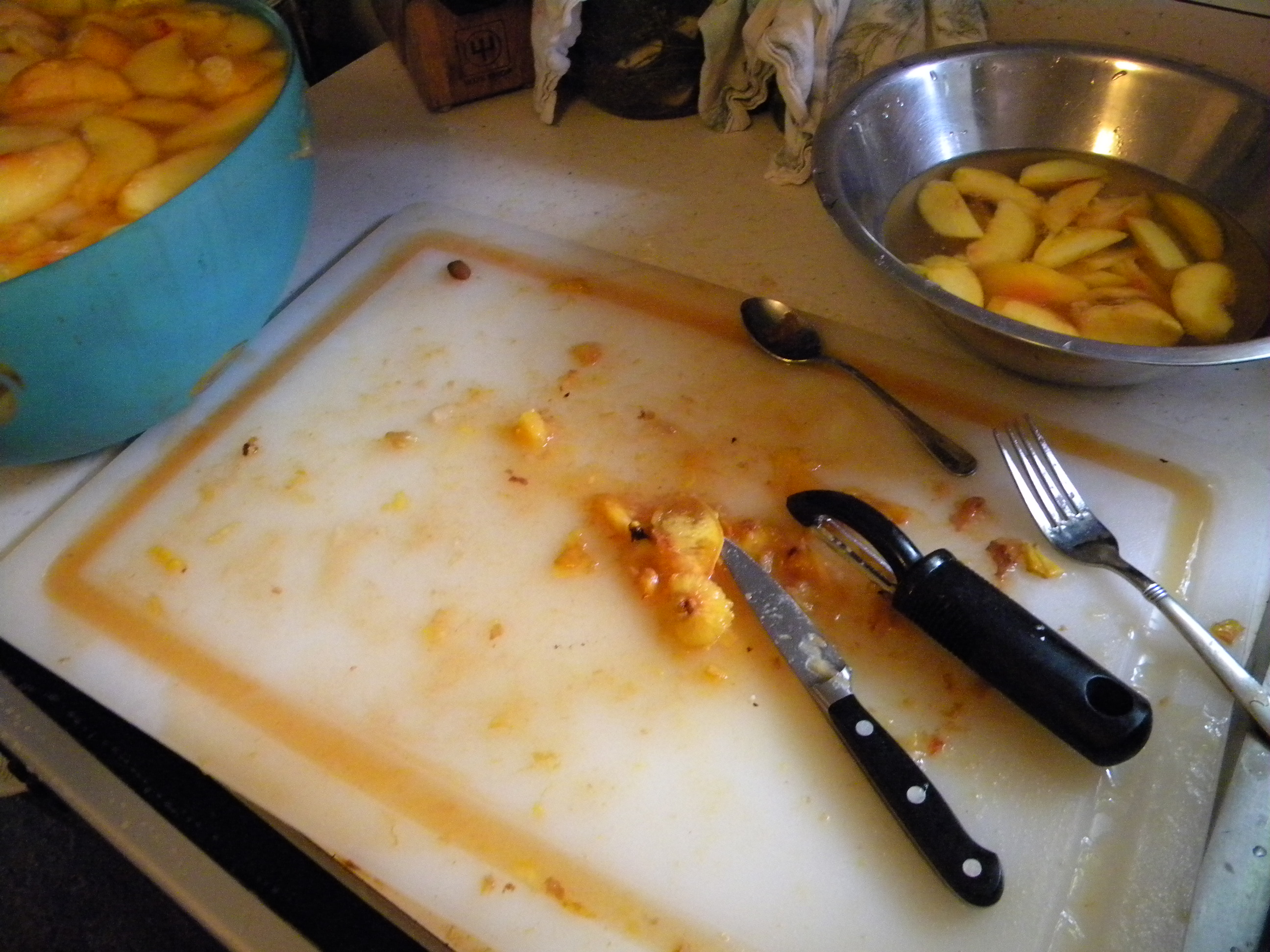 My set-up.  I have this large cutting board my Uncle Peter gave me as a wedding gift, along with a set of knives.  He was what Edie would call a meat-a-tarian, a carnivore through & through and he gave me the set so that I could cook my groom nice big hunks of meat.  It has a channel around the edge that catches juice – perfect for chopping mass quantities of peaches and tomatoes.  It’s large enough that it covers most of my two working square feet of counterspace, because this is what the other side looks like: