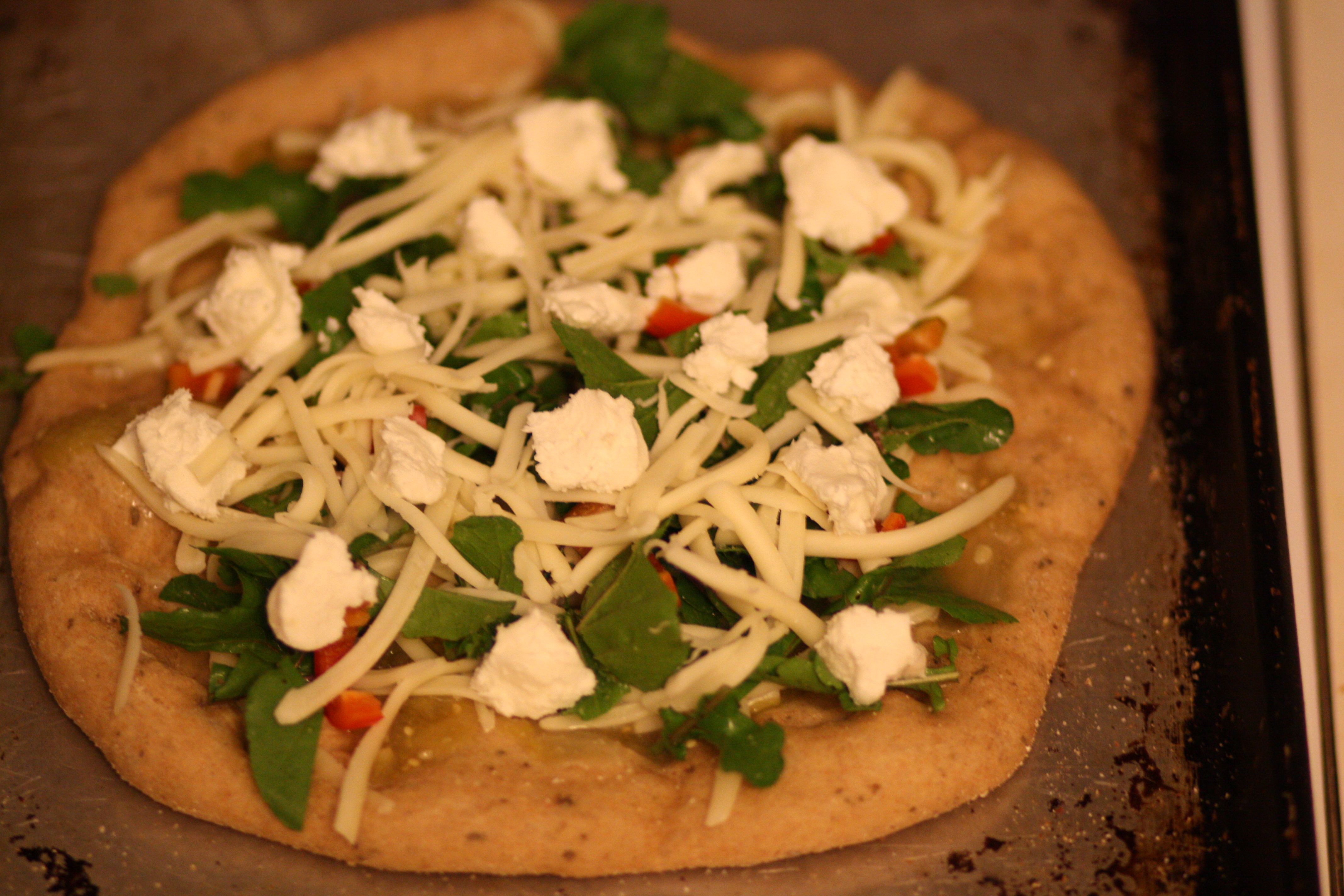 I’ve been known to use jarred sauce, but I tend to not have it around. Lately, I’ve been cooking down a jar of tomatoes with some garlic until they reach the right consistency – about 10 minutes or so. I also like using salsa, pesto, really whatever is in the fridge, as sauce. I have a pizza stone, but I haven’t been using it much lately. I prebake the plain crust for about 8 minutes, then load toppings on and stick it back in for 15 minutes.