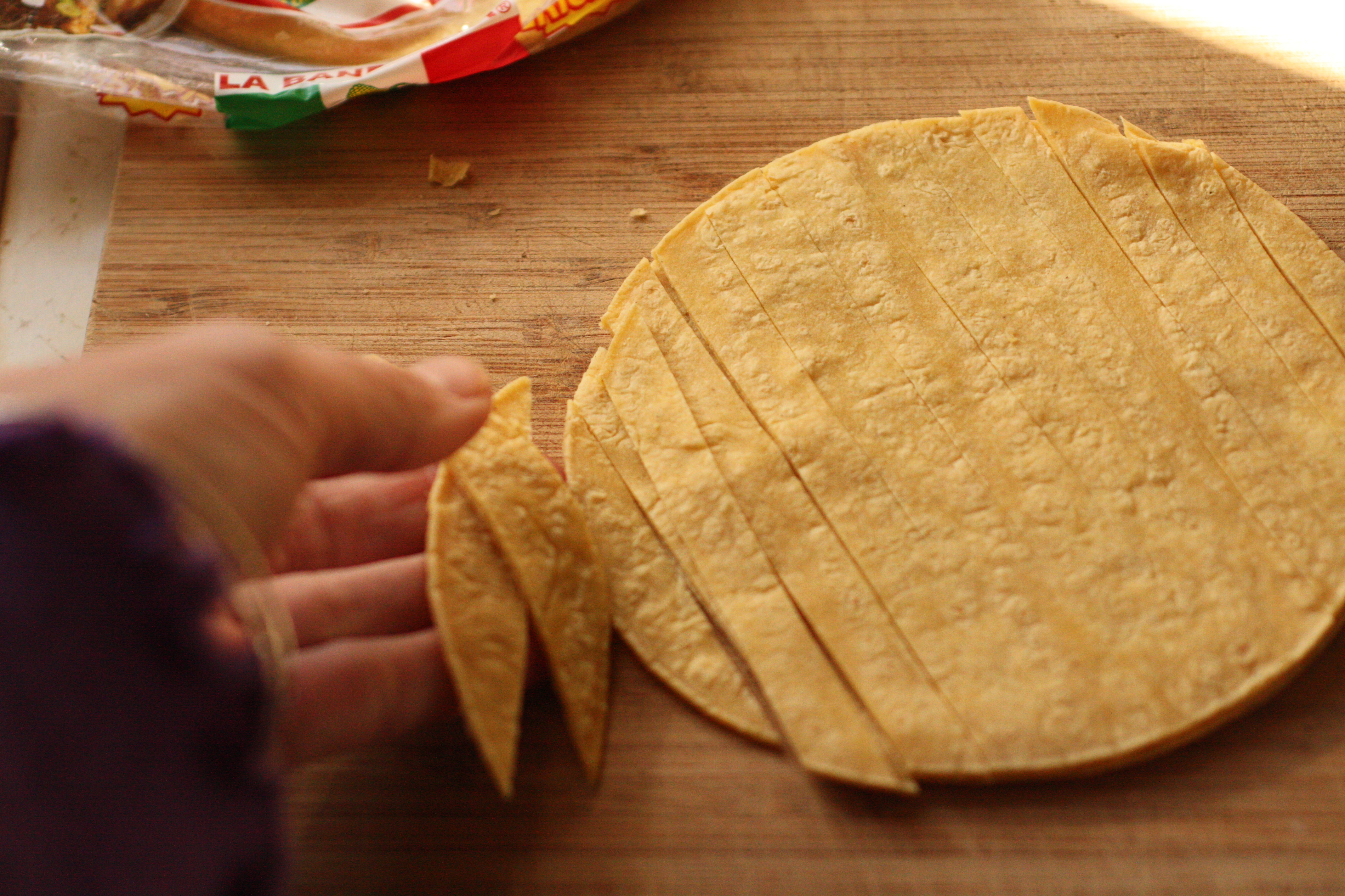 cookbooks 002Slice a small stack of corn tortillas into strips.  Spritz with some olive oil, sprinkle with salt and spread on a cookie sheet.  Bake at 350º for 8-10 minutes until toasted. You might want to make extras, as these tend to disappear from everyone wandering through the kitchen on their way to the dinner table.