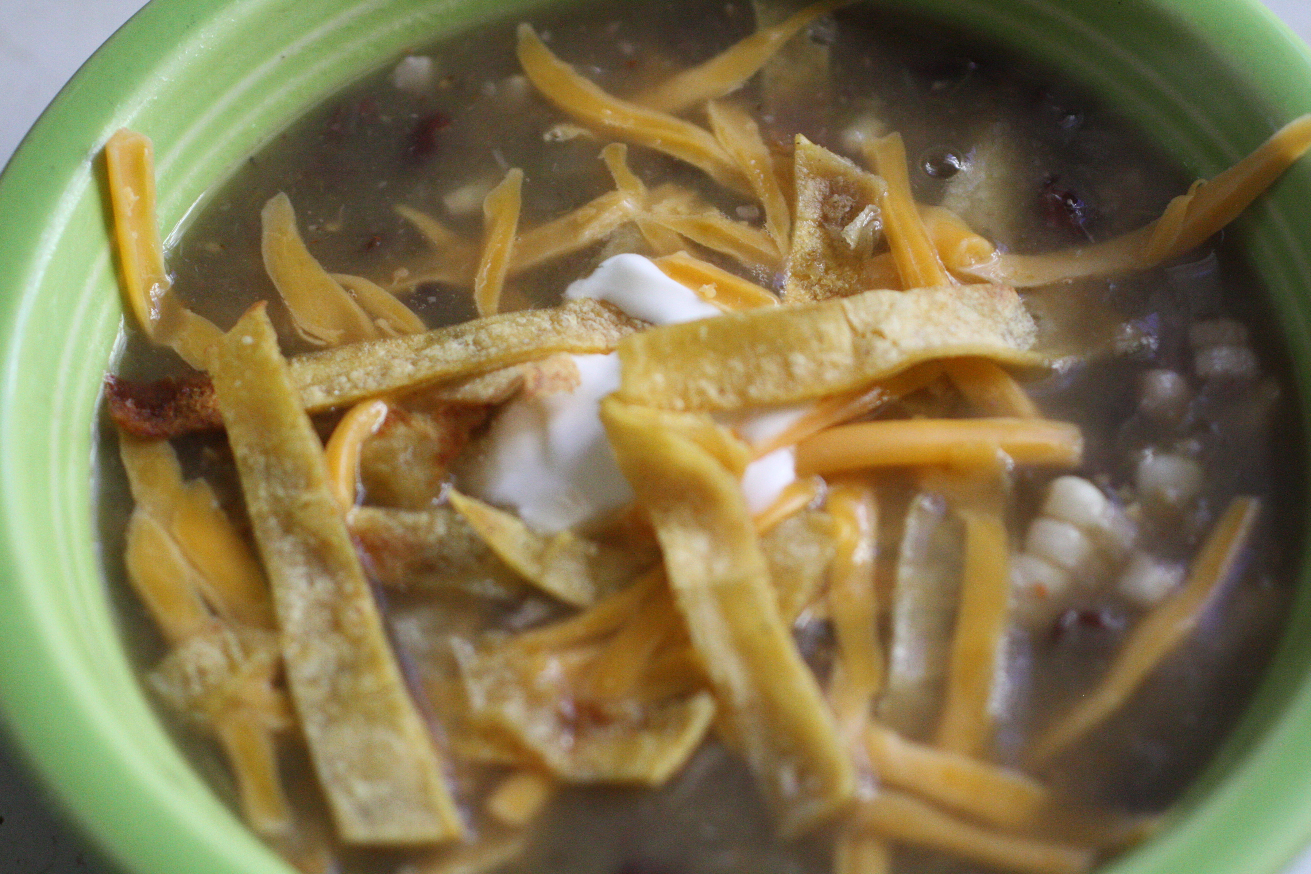 Serve with grated cheese, a dollop of sour cream and a handful of baked tortilla strips.  Fresh cilantro would probably be quite nice as well.  Enjoy.